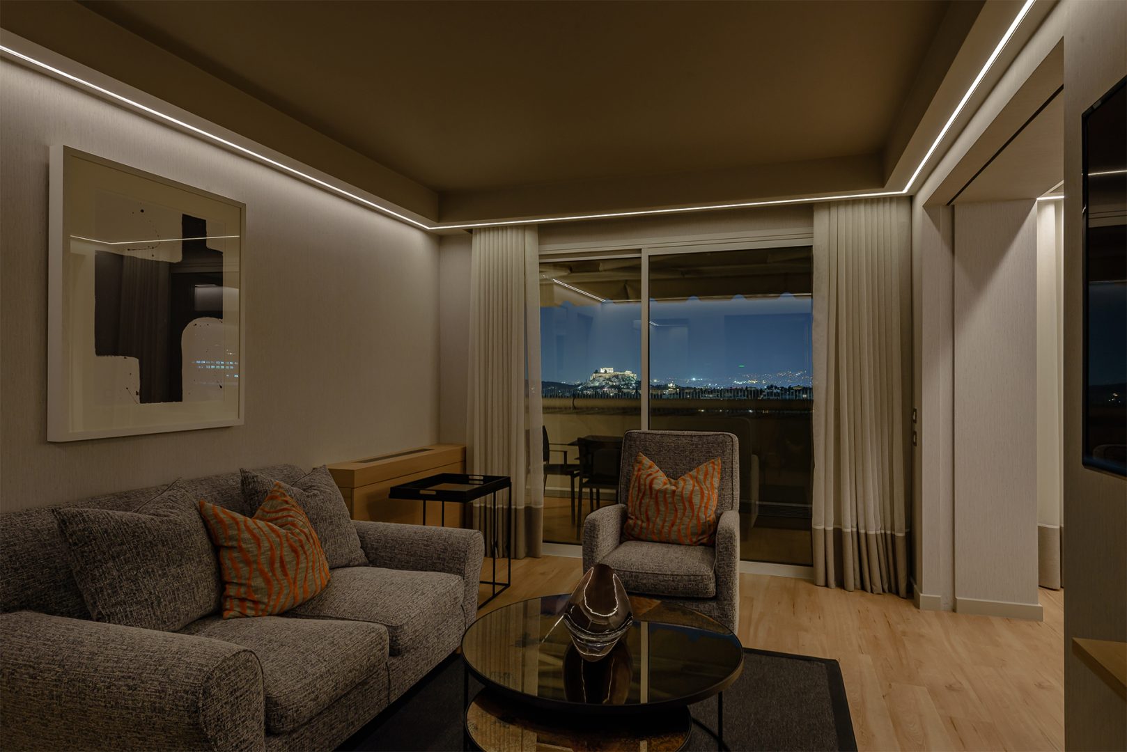 Συγκεκριμένα, επαναπροσδιόρισε το φωτισμό, αντικαθιστώντας τον υφιστάμενο και συμβατικό με έναν σύγχρονο φωτισμό υψηλών προδιαγραφών. Στόχος ήταν η ανάδειξη τόσο της αισθητικής των χώρων όσο και της λειτουργικότητάς τους. Για το λόγο αυτό, χρησιμοποιήθηκαν κυρίως κρυφοί φωτισμοί που προσφέρουν έμμεσο και ομοιόμορφο φωτισμό. Με τον τρόπο αυτό δημιουργήθηκε μια εκλεπτυσμένη και ρομαντική ατμόσφαιρα, δίνοντας έμφαση στον εξωτερικό χώρο και την υπέροχη θέα της Αθήνας, ενώ στα δωμάτια η εφαρμογή των κρυφών φωτισμών έδωσε μια αίσθηση ηρεμίας και χαλάρωσης για τους ενοίκους.